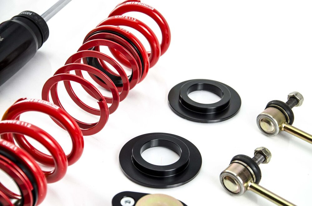 Specjalnie dobrany rodzaj gwintu i szeroki zakres regulacji zawieszenia umożliwia optymalne ustawienie wysokości auta także w zamontowanym stanie.